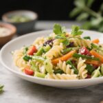 The dressing is a simple lemon-garlic vinaigrette that coats the noodles without weighing them down. You’ll get plenty of flavor from fresh herbs and a pop of tang from feta or goat cheese. It’s a flexible recipe that welcomes substitutions and works for meal prep.